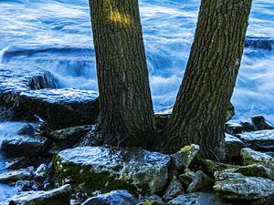 Long Exposure of Waves Crashing Rocks and Tree